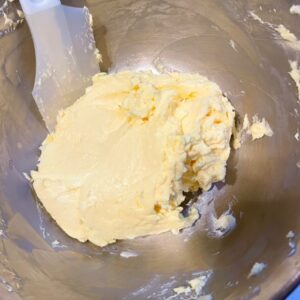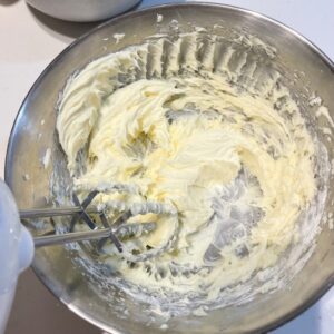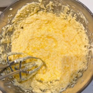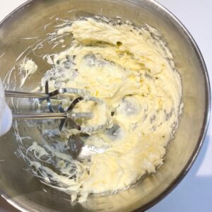最初はこのように分離している状態なので、生地が均一にクリーム状になるまでしっかり混ぜる。