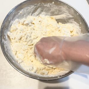 やりすぎるとグルテンができてしまうので全体こすりきったら生地をまとめていきます。