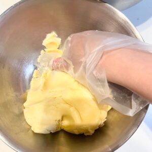 この工程をすることで、焼いたときに気泡が入りづらくツルっとした生地になります。